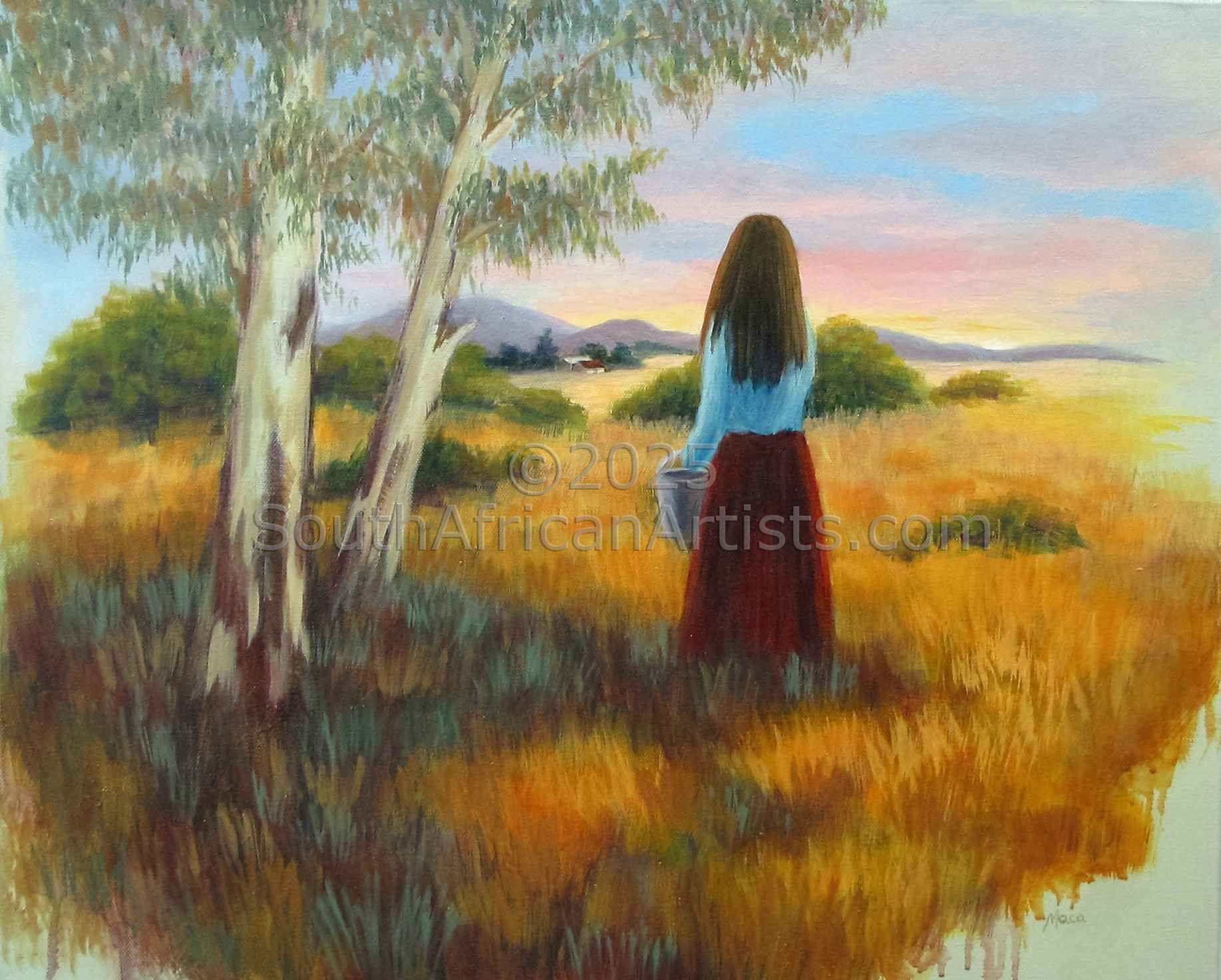 I love the process of making art and I especially love paintings that also shows the stages the painting went through, from sketchy to finely rendered. To me, it shows the hand of the artist and makes the painting so much more than a photo of the subject. I aim to paint representationally, contrasting realism with abstract, vintage with modern, rough with soft. Women and landscapes are a recurring theme because I have a strong connection with both and wish to celebrate their essence in my paintings. I am constantly learning and developing my craft and it is the most fulfilling journey and relationship with moments of utter joy (and despair). Price Range US$ 96-396 Exhibitions Sanlam prize for best painting on show during 2010 GWK Salon exhibition. Education studying books, dvd's and paintings, trial and error People who chose Maca's work also chose work by: Find other: