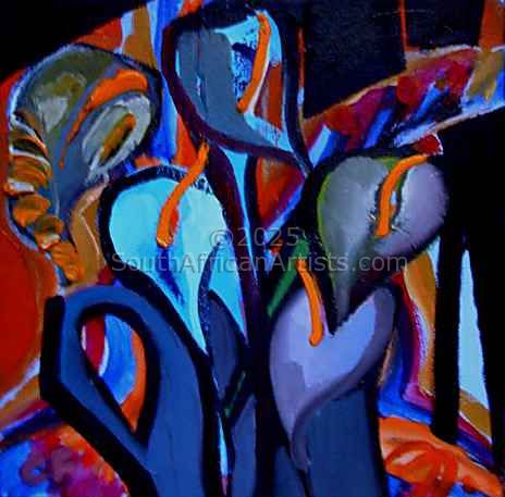 Because I paint fast, acrylic is my preferred medium, I start off a painting with broad painting paintbrushes to allow for a spontaneous background and effect to occur, the painting is then pulled together with a finer brush. When I use oils I do not use brushes but paint with my fingers only. The smaller paintings I do, help me with problem solving in my larger works. Price Range US$ 56-825 Exhibitions Flying Pig Gallery - Hermanus People who chose Celeste's work also chose work by: Find other: