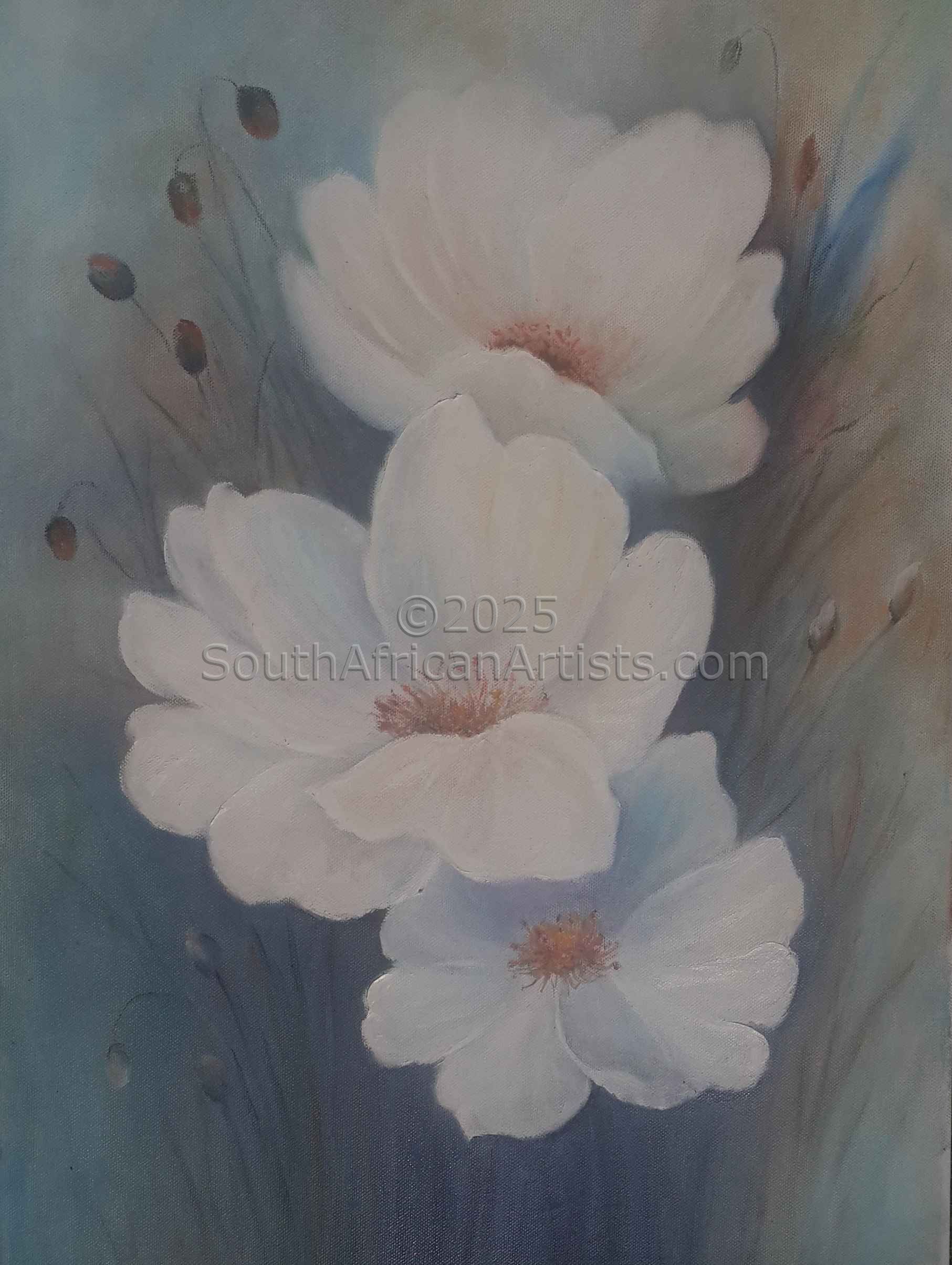 June 1953 - 9 May 2011 I attended private art classes of Jimmy Boonzaaier, Cecil Skotnis, Carlos Sdoya, Kathryn van Schalkwyk and Riaan Opperman, and was very inspired by their work and different techniques. Although I was trained in all mediums, I prefer oil.