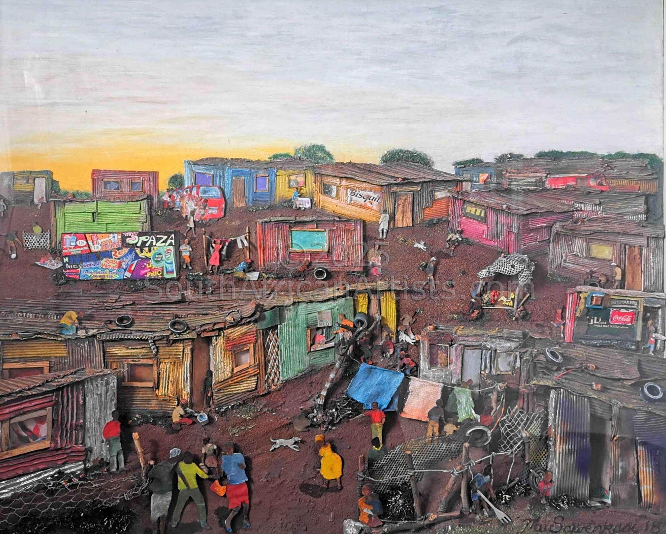 From a young age making toy cars from recycled bottles and wire just like other kids, I became inspired by all the scrapheap and recyclables that were scattered around the recycling center and how I can use it to create collage art works. I am a South African based self-taught artist whose paintings aim to convey a narrative of the emotions, fragility, beauty and ever-changing nature of life, from my own personal experiences of living in a diverse country as South Africa. Through my work i find and express emotions shared by many people in the country, especially those living in mainstream society. My role as a struggle artist naturally turns to one of charting the dramatic social and political developments in post-apartheid South Africa, addressing issues of crime, greed, poverty, corruption and government accountability in the new South Africa. Political and social incident motivates me to visit community recycling facilities where I spend the days meticulously selecting every detail for my art works. Scouring the scrapheaps and recyclables for discarded objects, a creative obsession evolved into recycling the waste of society into a powerful and thought-provoking platinum for social injustice political oppression and poverty. The Raw materials used represent the act of survival while the texture stresses questions of identity within society. I use materials of different sizes and textures in a aim to match the allowing for a three-dimensional effect on a flat surface. I aim to mix paint with vision, collage with story and character with meditation, producing artwork that reflects a release of energy imbued with life and raw simplicity. My overall aim is to evolve as an artist into not only a better artist who is a master of his craft but also into a better human being as well. I am to touch and change people's lives with my art, to make a difference by producing work that makes people stop to reflect on the world around them and see the beauty of/in it as well. I want people to embrace all that they are and to see the beauty in life even through the hardships.