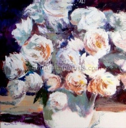 I started painting after I retired from Industry, and the best thing I did was to join the Watercolour Society of South Africa, where I made many wonderful friends and I gained my Associate of the Watercolour Society in 2004. I then switched to acrylics, as the speed of execution of each painting and the bright colours appealed to my impatient nature. I currently paint with the Ivy Artists- a group of ex students of Sue Kemp, who have become firm friends and enthusiastic producers of artworks.
