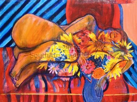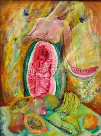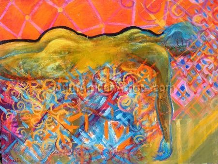 "I look upon my Watercolours as poems - smaller work (landscapes or nudes) done quickly on the spot. The acrylics are like novels - bigger, worked on for a longer period of time, layered. Here I usually explore a poetic or mythological theme." She often listened to Bach every morning "to purify the soul".