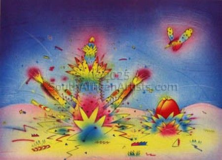 In 1969 he held his first solo exhibition consisting of oil paintings on wood, bone, wire and an assortment of found objects. His art has since undergone several metamorphoses, from the pristine airbrush paintings of the 70s to the frenzied, ritualistic mixed media works of the early and mid 80s; the wire sculptures and tin can works of the late 80s, and the primitive-futuristic paintings of the early 90s which provided the seeds for his pre-millennial menagerie of anthropomorphic beasts. In the thirty years spanning his past and present output, Catherine[0x1]s visual trademarks have included rough-edged comical and nightmarish forms, rendered in brash cartoon colours. His idiosyncratic vision - a combination of dark cynicism and exuberant humour, as well as his innovative use of everyday materials, has secured his place at the forefront of South African contemporary art. Hazel Friedman
