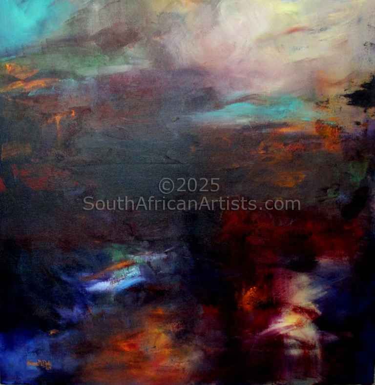 I live on the Bluff in Durban and due to the Bluff's elevation, it has the most spectacular sea views and this is the inspiration for all my seascapes. Durban is sub-tropical and has a lucious growth of beautiful flowering shrubs and trees. One does not have to go far, to be inspired to paint. I enjoy design, colour and texture to create an effect. Sometimes I paint the same flower in three different sizes, to be exhibited together. Ultimately I am a "design" artist, if that makes any sense.