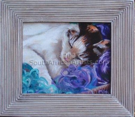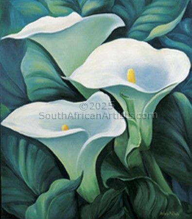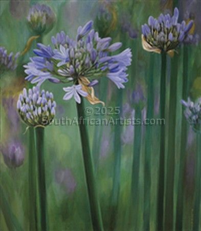 I live on the Bluff in Durban and due to the Bluff's elevation, it has the most spectacular sea views and this is the inspiration for all my seascapes. Durban is sub-tropical and has a lucious growth of beautiful flowering shrubs and trees. One does not have to go far, to be inspired to paint. I enjoy design, colour and texture to create an effect. Sometimes I paint the same flower in three different sizes, to be exhibited together. Ultimately I am a "design" artist, if that makes any sense.