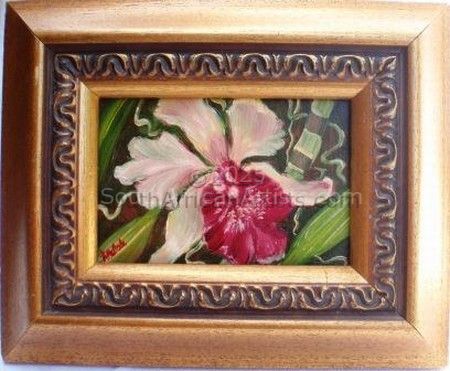 I live on the Bluff in Durban and due to the Bluff's elevation, it has the most spectacular sea views and this is the inspiration for all my seascapes. Durban is sub-tropical and has a lucious growth of beautiful flowering shrubs and trees. One does not have to go far, to be inspired to paint. I enjoy design, colour and texture to create an effect. Sometimes I paint the same flower in three different sizes, to be exhibited together. Ultimately I am a "design" artist, if that makes any sense.