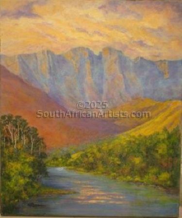 During 2003, after 41 years, Ella and her family relocated to the beautiful Hartbeespoort valley to retire. Ella's favourite subjects are genuine well-known SA landscapes of the Drakensberg, Cape, Pilgrimsrest, specific waterfalls, marine life, interesting rock formations of the Cedarberg and Cango caves.
