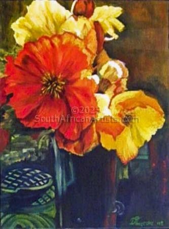 Dorothea Was born in the Natal Midlands, her parents were farmers. Growing up in the countryside, she developed a great love for Nature; especially wild flowers, which were to, became a lifelong passion. At the age 13 she entered a flower show and won first prize in her category. This resulted in a memorable moment for her. Over the years she has entered many national and international art shows and won several prestigious awards. She married early in life and had three children; she was a stay-at- home Mom but always-found time to pursue her various artistic interests. She learned the art of working Pewter and Copper, something that was very fashionable at the time. Her efforts in this regard did not go unnoticed and she went on to win an honorary award at the Royal show in Pietermaritzburg. When her children where older and she had more time on her hands, she went for Art classers and was taught by professional Artists in Oils. She has exhibited in several public exhibitions where she has sold her work. Having relocated from Natal, she now resides in the most inspiring place of all, Cape Town where there is such an abundance of Flora and such diversity in landscape and life. This is now the inspiration for her Art. She works in soft pastels and oils and her work is displayed at the S.A.A.S. exhibitions at Kirstenbosh botanical Gardens. She is going to be having an exhibition of her own in July. Dorothea[0x1]s work is realistic and really conveys her deep love for flowers and nature.
