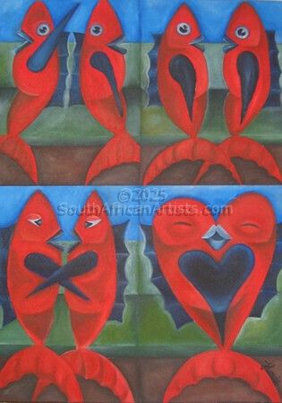 During her training as a clothing designer she ecquired knowledge of figure drawing, colour and textures. This ability proved to be of great ddvantage when she became aware of the intriguing expressions f the 'Xam people' (Bushman) in their Rock Art, while visiting sites known for this art form. Spiritual symbols in geometric forms which they used to communicate through in trance dancing, fascinated her and inspired her to use these symbols to create paintings with a strong modern feel but with a very ancient spiritual connotation. Her love for nature, people and experiences made her very creative and original.