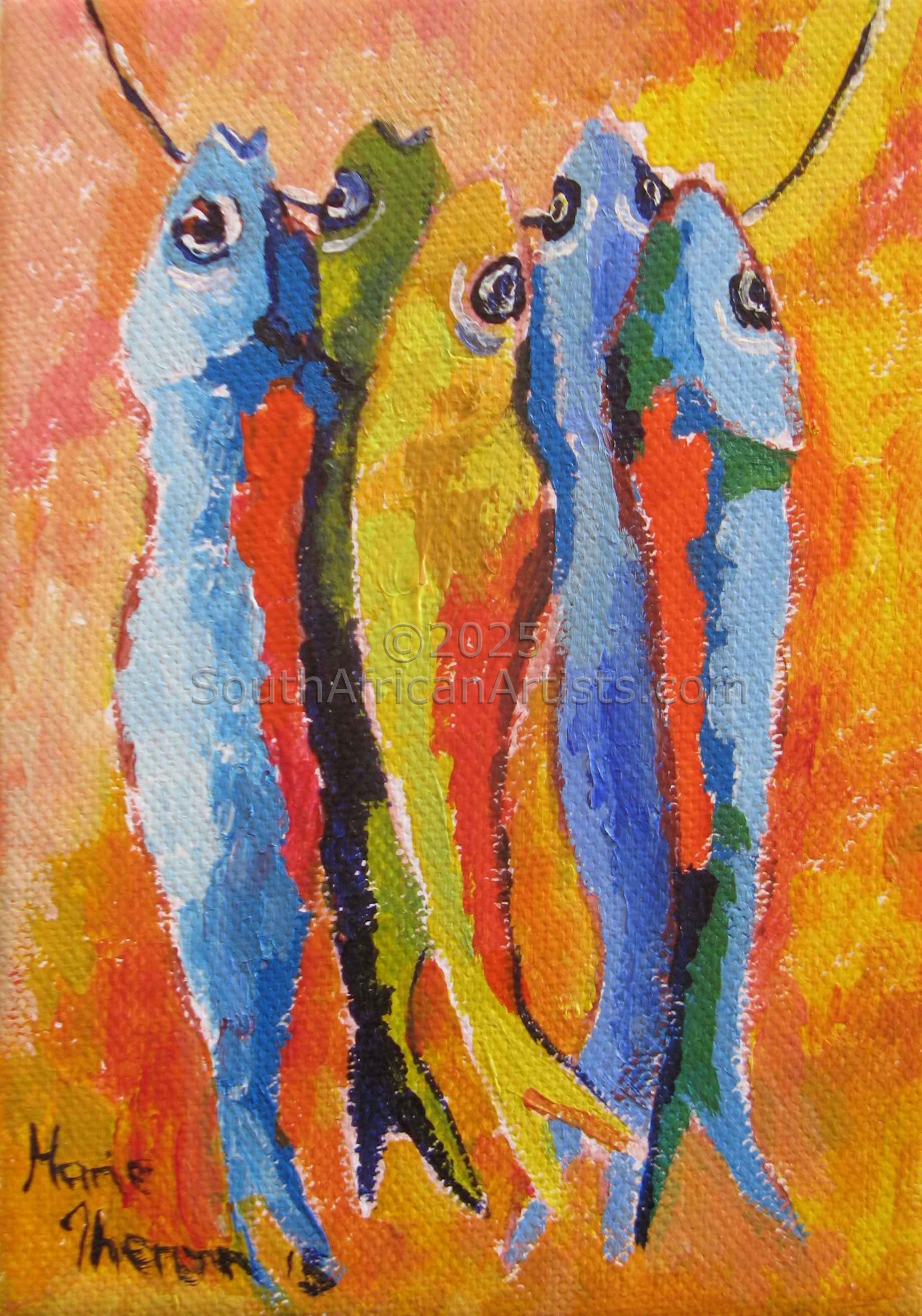 South African Marie Theron (b. 1944) was trained as an Art Teacher. She has held solo exhibitions both locally and overseas and has participated in exclusive group exhibitions. Investors in her oil and acrylic works range from foreign embassies, corporate offices, guesthouses, libraries, hospitals and international private collectors. Her work has sold in Australia, Britain, Canada, Croatia, Ireland, Hungary, the Netherlands, Germany, Austria and the USA (more than 30 paintings in America) She was commissioned by the Ass of Arts Pretoria, the Croatian Embassy and Academia Cravatica in Zagreb to submit a painting "Sister Power" for "The Challenge of the Tie", a world-touring permanent exhibition which toured Pretoria, Johannesburg, Brussels, Prague and Brazilia in 2005 and further around the globe in 2006.