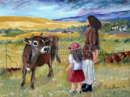 South African Marie Theron (b. 1944) was trained as an Art Teacher. She has held solo exhibitions both locally and overseas and has participated in exclusive group exhibitions. Investors in her oil and acrylic works range from foreign embassies, corporate offices, guesthouses, libraries, hospitals and international private collectors. Her work has sold in Australia, Britain, Canada, Croatia, Ireland, Hungary, the Netherlands, Germany, Austria and the USA (more than 30 paintings in America) She was commissioned by the Ass of Arts Pretoria, the Croatian Embassy and Academia Cravatica in Zagreb to submit a painting "Sister Power" for "The Challenge of the Tie", a world-touring permanent exhibition which toured Pretoria, Johannesburg, Brussels, Prague and Brazilia in 2005 and further around the globe in 2006.