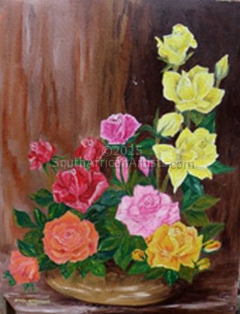 As a child I always loved drawing, sketching etc. Worked many years as a bookkeeper with the thought in mind that I oneday would like to paint. At that stage I never had the time to do so. After retiring I was bored with nothing of value to do so had many hobbies ie needlepoint, knitting, sewing, decopage, beadwork, crochet, reading, fabric painting etc. My husband and I have lived on our Dairy Farm in Macleantown for the past 45 years. We have one son who with his wife and our two grandsons live on the farm. Eleven years ago I was inspired by my younger sister Valerie Weber to start painting. Her paintings were magnificent. After taking some basic lessons I developed my own style of painting using oils on canvas. I simply enjoy painting whatever the subject may be. My favourite, being animals and flowers. I have exhibited and sold mostly in South Africa. Exhibitions at Queenstown, King Williams Town, Stutterheim and East London. I also sold a painting to someone in New Zealand. God willing I will continue painting for many more years. Price Range US$ 64-122 Exhibitions Exhibited at art shows in Queenstown, Stutterheim, East London and King Williams Town. Education Self Taught People who chose Sylvia's work also chose work by: Find other: