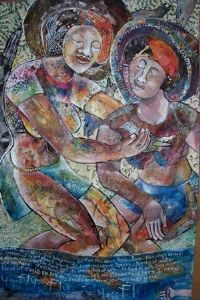 The image portrays the origin of humankind and the soul rising to eternal destiny. Both "bodies" are surrounded by the halo of spirit. A prayer rises from the waters below and one is reminded that at one stage of creation, the waters were hanging above the earth. The prayer is for the water of life to rain down and for the bread of life to come and nourish - we need nourishment, renewal and a turning away from the lust of the flesh and the lust of the eye...