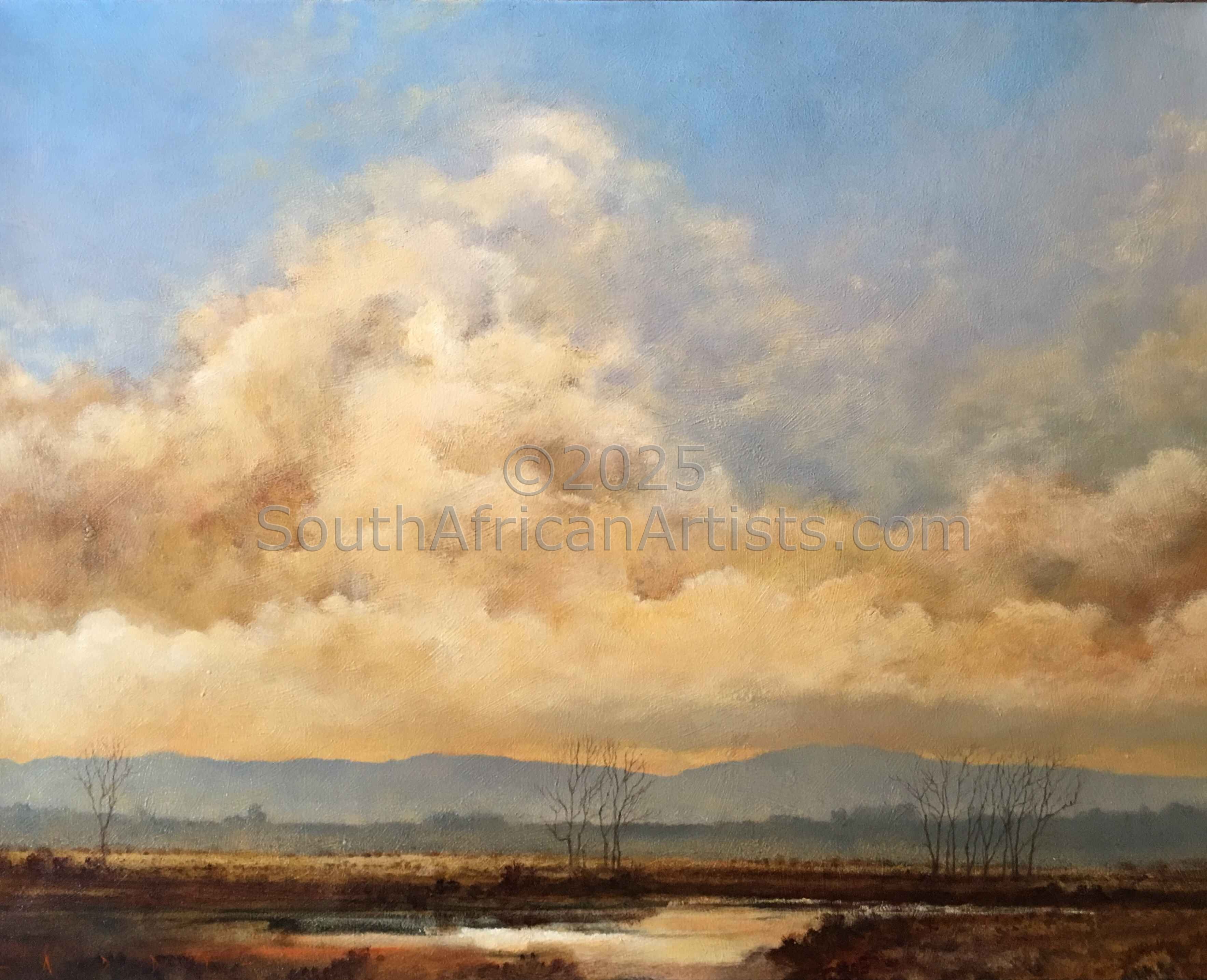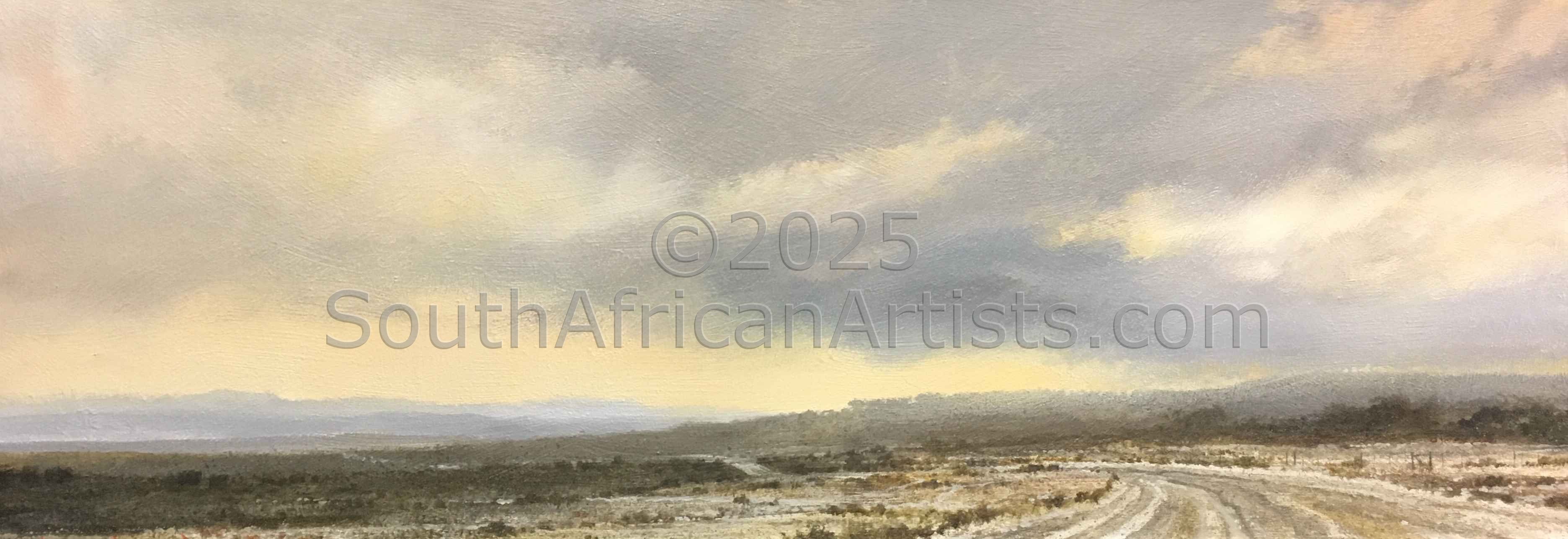 Rendered with a passion and technical facility reminiscent of the Old Masters, Simon's landscapes evoke the spirit of the Eastern Highlands' bleached winter grasses, veldfires, and old stone houses under brooding skies. His travels in search of soulful scenery produce moody studies of wintry Natal Midlands river-courses and wetlands, and deserted Northern Cape farmhouses.