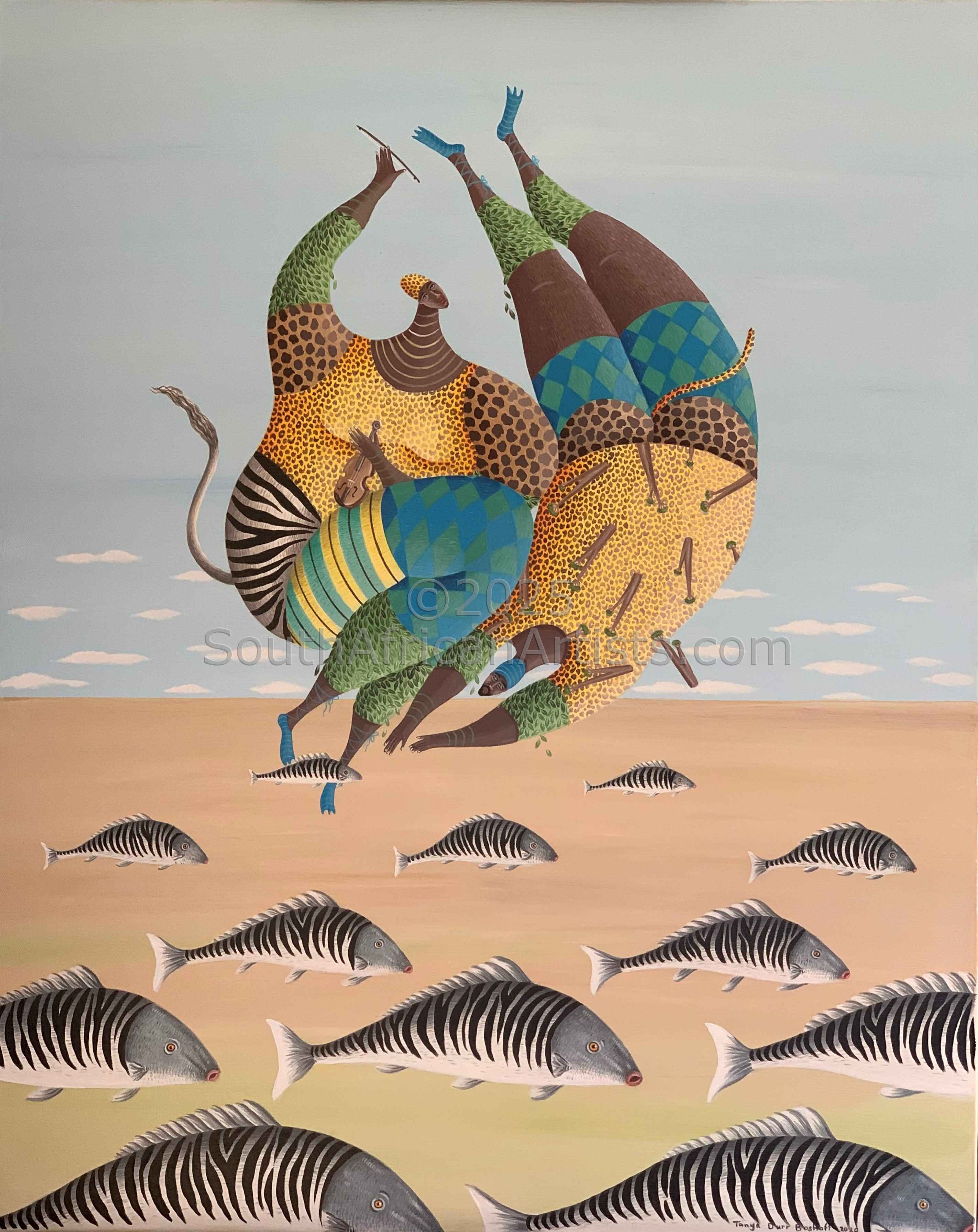 Tanya was born (18/12/1964) and grew up in Cape Town. She attended Wynberg Girls' High School where art was her favourite subject. Noticing her incredible talent, she was encouraged by her art teachers to pursue the arts after she matriculated. She studied at and obtained a BA in Fine Arts/ Graphics from the University of Stellenbosch in 1987. Her art lecturers, Niki Daly, Paddy Bouma, Paul Emsley, Larry Scully, Hardy Botha and Cecil Skotnes had a huge influence on her art and encouraged her to explore her imagination with the use of different mediums and techniques, e.g. woodcut, lithography, silkscreen, etching, mixed media, pencil, scraperboard and oil paint. Tanya specialises in gouache (a water-based paint) and acrylic. Her work has been sold to both South African and overseas art buyers. She has done illustration work for Cosmopolitan and Fair Lady magazines amongst others. She worked for Leisure Hour, producing book catalogues in the 1980s, doing layout work, illustrations as well as photography. Tanya, her husband and three children, lived in Montagu in the Klein Karoo from 1990 to 1996. This is where she started her personalised paintings after being commissioned by Sylvia Krige, wife of South African artist Francois Krige, to do a painting for her nephew, a film producer, living in New York, USA. During her time in Montagu Tanya became close friends with Inger Welz, the wife of South African artist Jean Welz. Inger had a huge impact on Tanya's life and encouraged her to paint as much as possible. Marlow Walters of the 'Tuscany Gallery' in Montagu, exhibited and sold Tanya's paintings while she was living there. Tanya had an exhibition in Franschoek at the 'Art de Vivre Gallery' and the owner, Marina Todd, had this to say about Tanya's paintings: 'Her unique style flows out of traditional African folklore themes. Joyful, exuberant and dreamlike, the detailed images that fill her landscapes and portraits bring to mind the fruitful, abundant land in the midst of change that is the inspiring, modern renaissance of South Africa.' She also exhibited and sold her paintings at 'The Lipschitz Gallery' in Plettenberg Bay, George Stegmann's 'Bay Fine Art Gallery' in St. Francis Bay, Eastern Cape and 'Rossouw Modern Art Galleries' in Hermanus and Groot Constantia. Tanya exhibited seven of her painting at a South African Art Exhibition held at 'The Studio' in Kings Road, Chelsea, London. All seven sold. Six were bought and brought back to South Africa where they are still exhibited at the Twelve Apostles Hotel, Camps Bay, Cape Town, South Africa. Tanya has done several commissioned paintings for a local interior designer as well as commissions for a private family to showcase the unveiling of their new home in Australia.