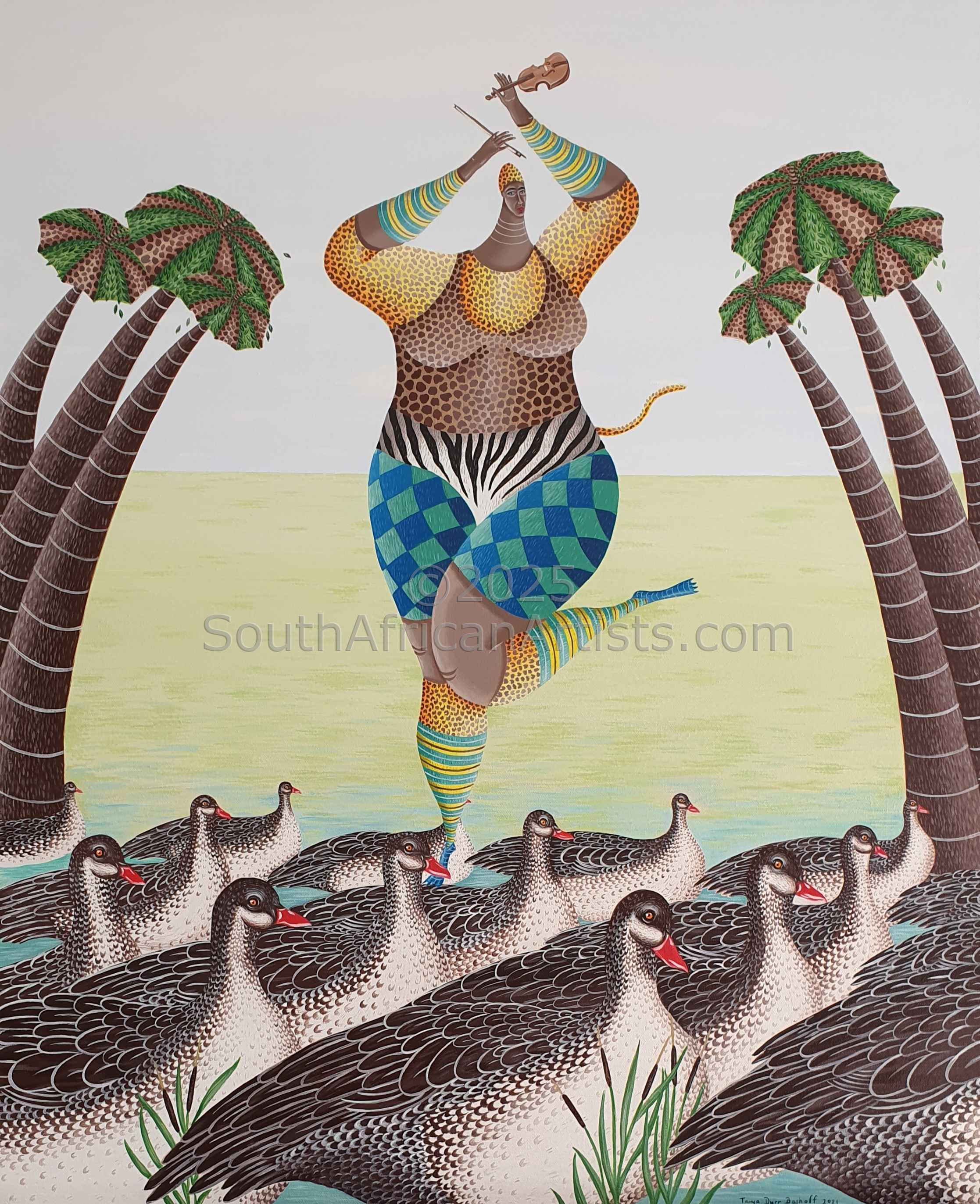 ARTIST'S STATEMENT My creations are spontaneous and incorporate elements of nature, animals and humans in a tranquil setting. I make use of bold images and symbols that offer interpretation rather than a reflection of the natural environment. I like to juxtapose the unexpected which appears normal to the viewer. My paintings are filled with meticulous detail which pulls the viewer into a peaceful world. My art stems from deep love of texture, colour and patterns and the use of a 000 brush to clothe the animals in their fur and the figures in their layers of patterned, colourful clothes. Although I have explored different mediums and techniques, I am currently enjoying painting with acrylic on canvas. Art is my passion. I am inspired by people and nature with its diversity. A painting is successful if it can bring my viewer hope and joy in a world of turmoil.