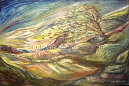 Currently I do genre paintings – people in everyday, ordinary situations – as well as landscapes in oil, acrylics and watercolor. I explore the calm serenity of the Free State countryside in contrast to the busier street scenes and inner city life as this part of the world has been my life for the past twenty odd years. Bloemfontein and the surrounding area is known for the endless open spaces, with beautiful bold clouds and blue skies in contrast to the earthy yellows, red and browns of the grasslands and the farming soil. In town you get the chance to experience a sense of life and here you meet people from very different cultures and backgrounds, as Bloemfontein is demographically very central in South Africa. I believe that this lovely, peaceful place is the heart of our beautiful country.