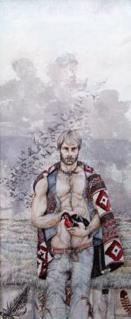 Man with migrating birds under a silver cloud. The figure does not illustrate the progress of the seasons (child to old age) but the background does. The use of silver represents desolation. Further, the panels at the bottom of the work, in a way, illustrate the season and the environment depicted. Therefore the season is represented through color, motif and landscape - my own particular vision.