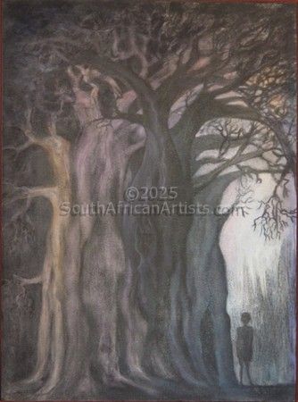 About "Be My Shelter" Baobabs are very special trees and I have painted them often over the years. They are so quintessentially African. They represent happy memories for me because I grew up in Harare, as landlocked as you can get, but whichever direction we travelled in for holidays, whether to Mozambique or South Africa for beach holidays, or to any of the lovely spots we frequented along the Zambezi, from Victoria Falls to Kariba or Mana Pools, we always had to go through a lowveld area dotted with these comical amazing trees. There is a wonderful one on the road to Beit Bridge from Harare, which is hollowed out, and has a cathedral like feeling when standing inside it. As in my ongoing Africa weeps for her Children series, the concern for nurture needed by children is also present. |
