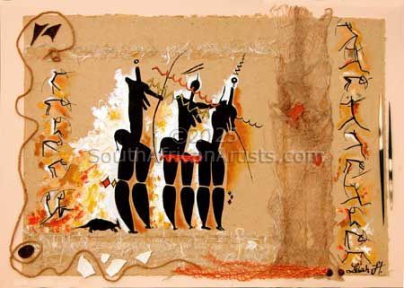 About "Bushman Painting Three Mothers Collage" Authentic Rock painting with out of Africa symbolic elements. |