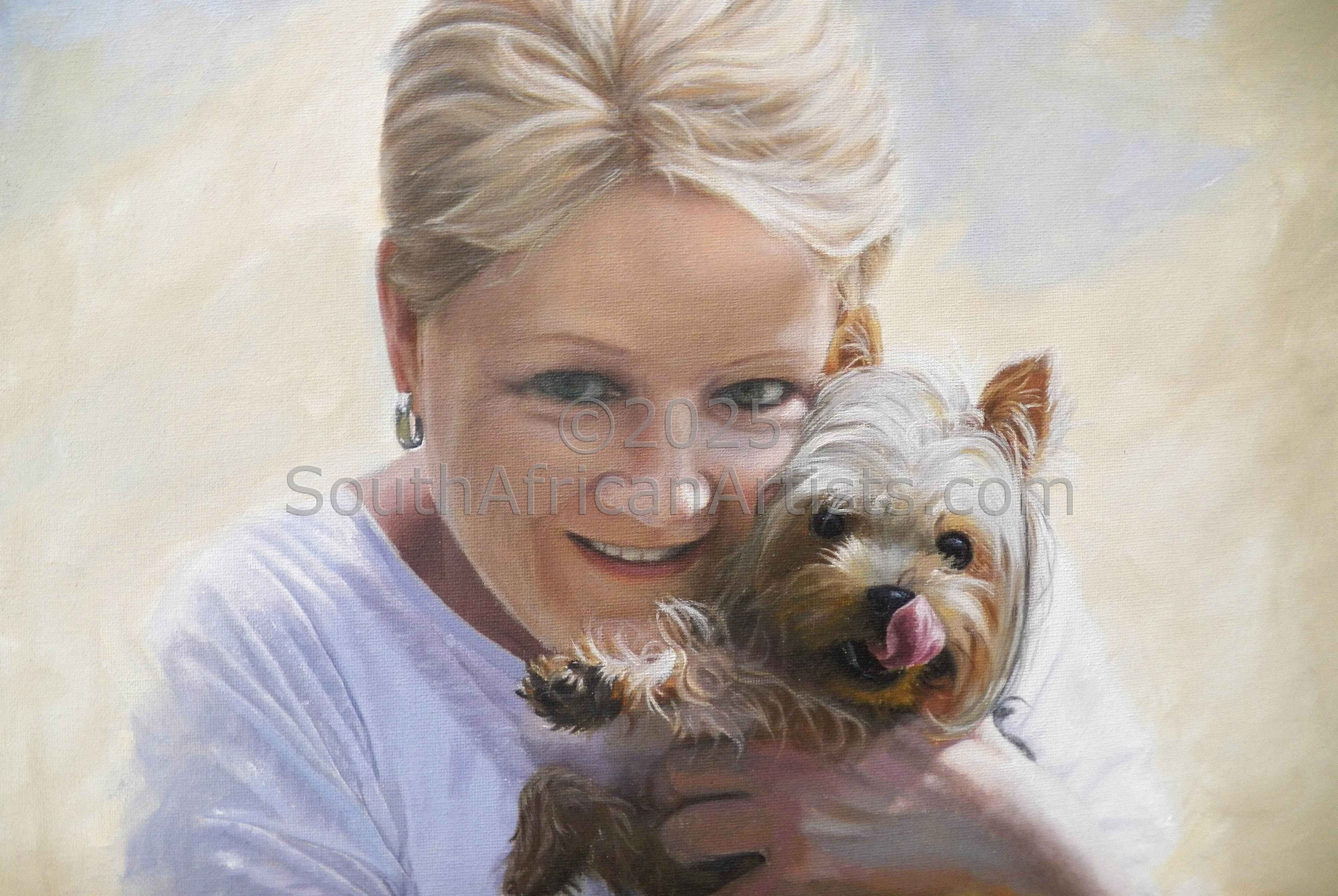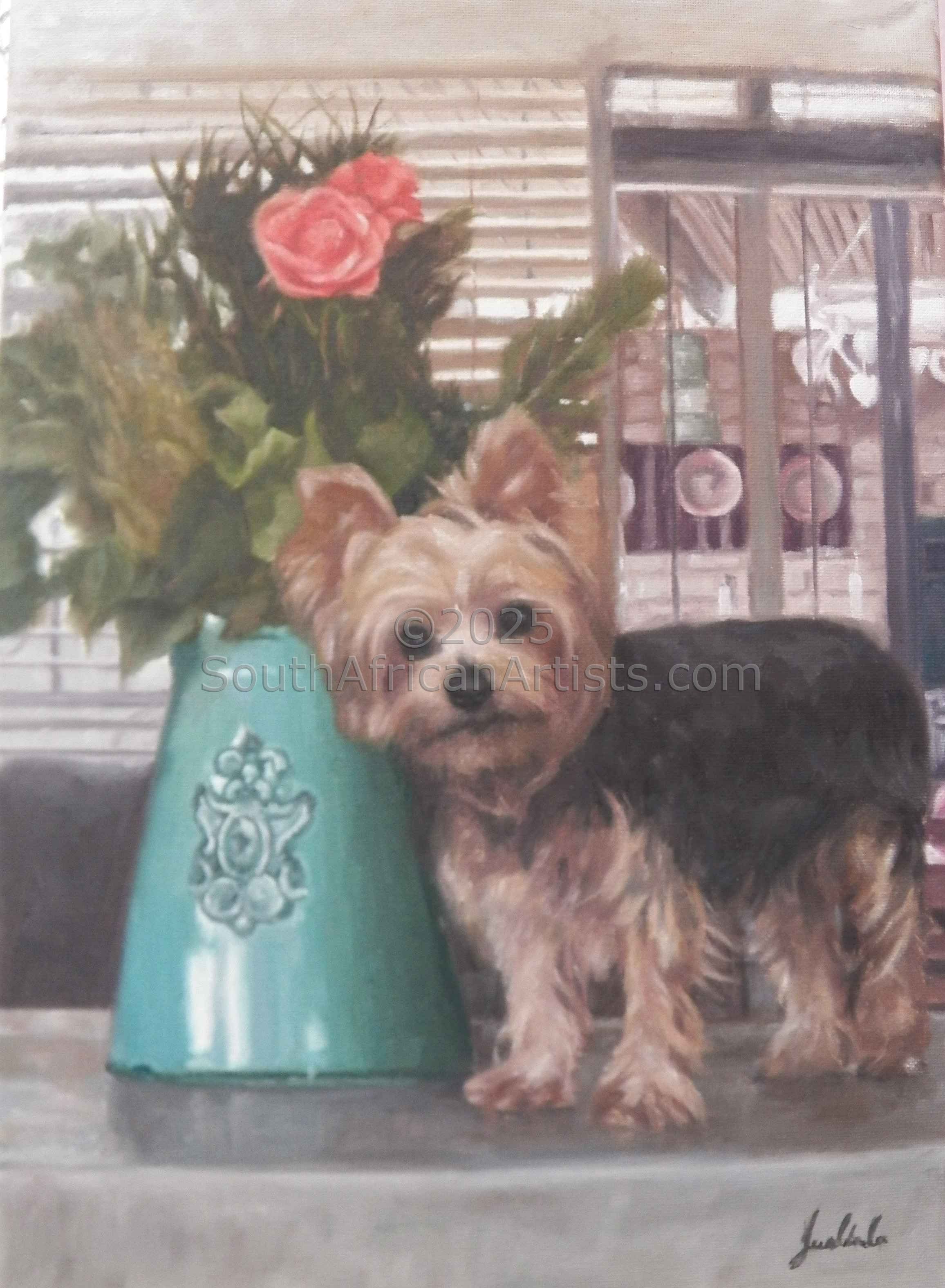 Yorkie and Vase with Flowers