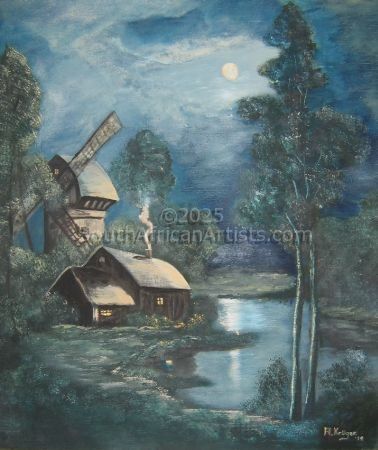 Dutch Windmill in moonlight