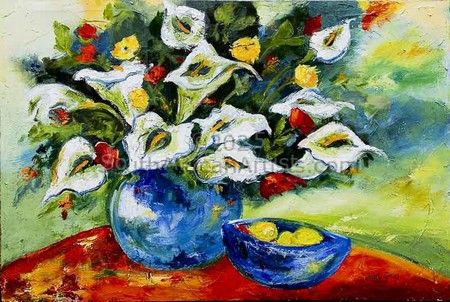 Arums in Blue Vase with Lemons