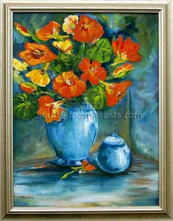 Nasturtiums in blue vase and bowl