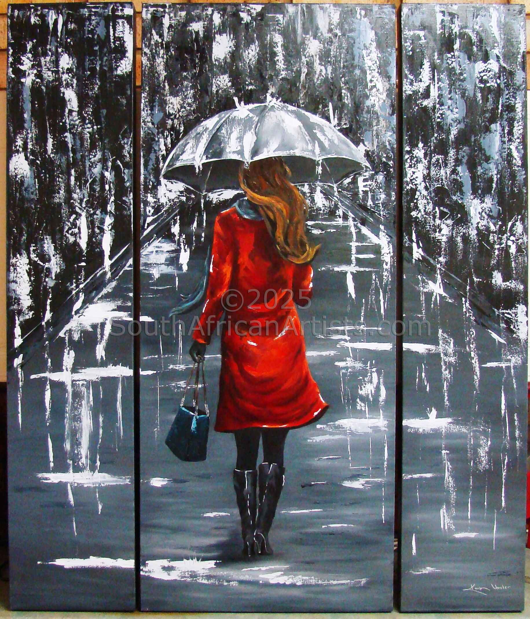 Karin Vorster - "Lady in Red Walking in Rain (Triptych)" |