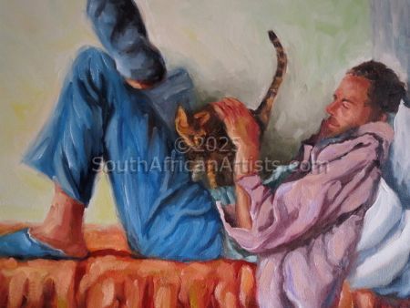 About "Man with Cat" I wanted to capture this moment on canvas as i am familiar with having a cat sleep on my lap while i read or rest. |