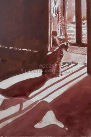Reference MSS 1/24 About "Morning Sun Series #1" To take a break from painting in oils and doing some drawing, I enjoy doing studies of cat(s). We have four cats in the house offering plenty of original images to work from. I start with a light gestural pencil drawing. Once the composition is in place, acrylic ink follow (with a single Sable brush) and I work strictly onto 210gsm acid free paper. |