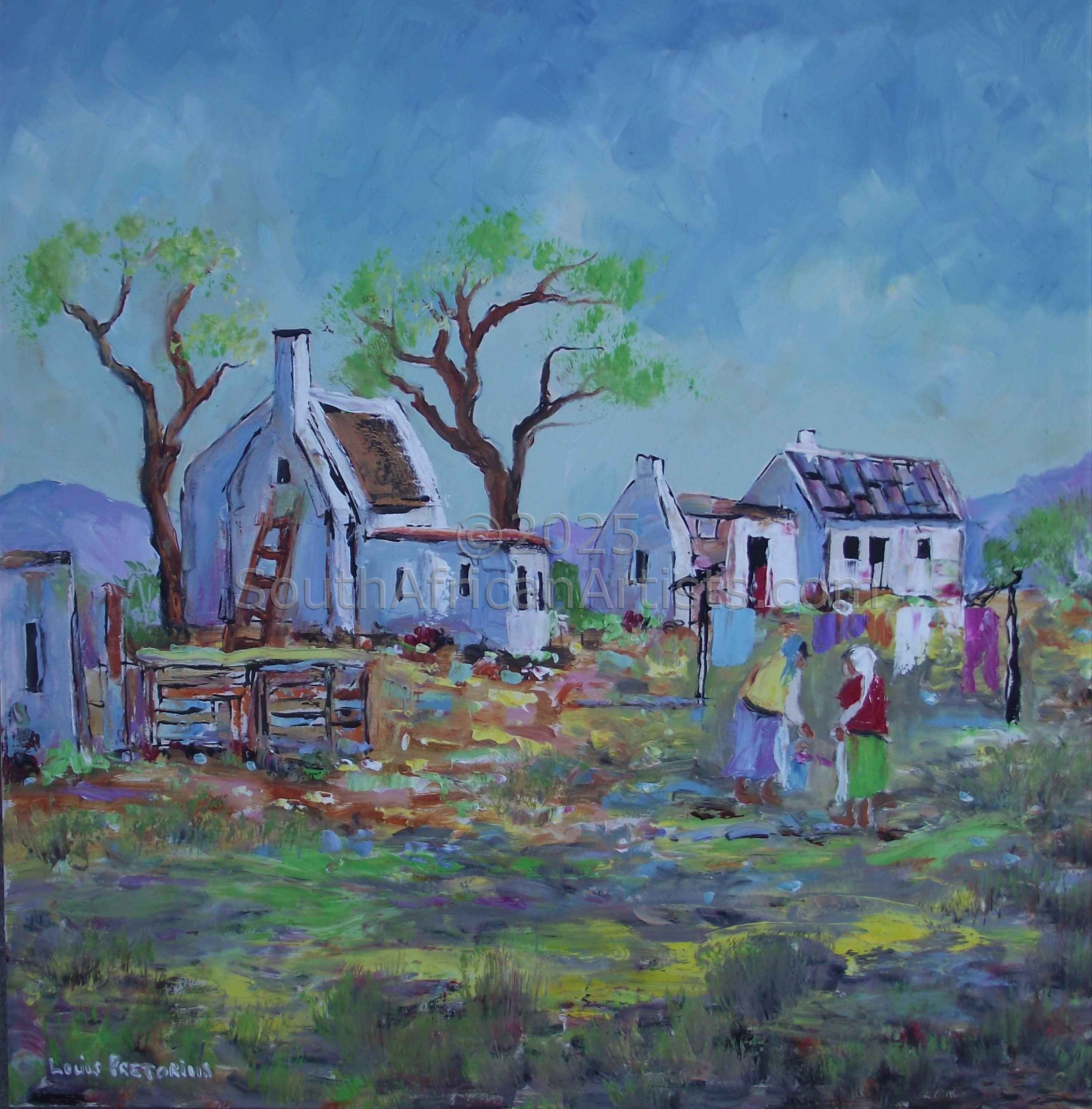 About "Platteland Lockdown Washing" This artwork was done during the Lock down in South Africa.On this painting two women were outside to hang the washing. |