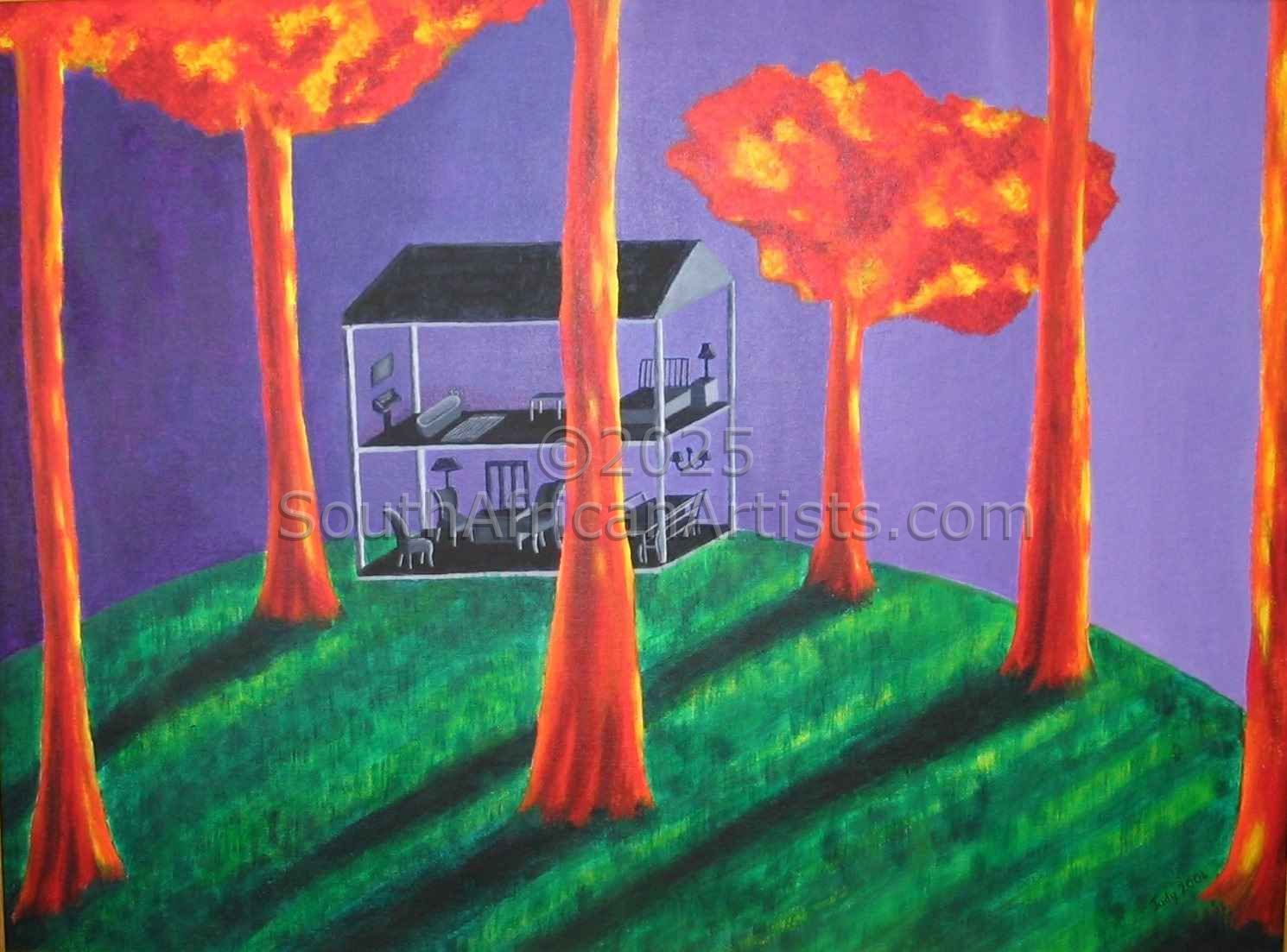 Reference 7 About "Safe House" A dream painting - I was traveling by car with friends. Lost and somewhat concerned, we came through a clearing and found this house on a green hill, surrounded by trees. Despite having no walls, the house and the area around it, felt safe. |