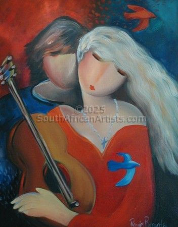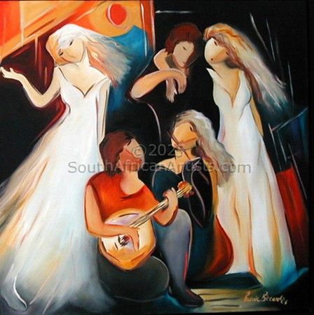 I have been painting for more than 30 years. I have exhibited extensively in this time, having solo exhibitions and participating in many group exhibitions in major cities in South Africa. I have also had a one-man exhibition in Florida, USA and have collectors throughout the world. My colour palette is strong and vibrant; I use a range of colours from saturated primary, secondary and tertiaries, right through to muted earth tones in some paintings. Colour is an important element in my work. From early in my art career I have explored the recurring theme of women and human relationships. My recent work reflects the love, mystery and solitude of modern Women which I refer to as Modern Goddesses. They have anonymous faces and fluid bodies,they transcend reality and express the feminine aspect of human nature. They reflect the graceful movements of human emotion where warmth,charm, joy and love reside. The Modern Goddesses, in my paintings celebratemothers, sisters, daughters, lovers, wives and friends. There is an element of whimsy and fantasy to my work- I transform and interpret information or reference into personal visual statements where the viewer can relate on a personal, subconscious and emotional level. I paint in oils and acrylics. See my SPIRIT PAINTINGS. I use your date of birth,astrological signs, guardian angels, elementals, gods, goddesses,totem animals, archetypes,flowers, colours, crystals, instruments, and elements etc.