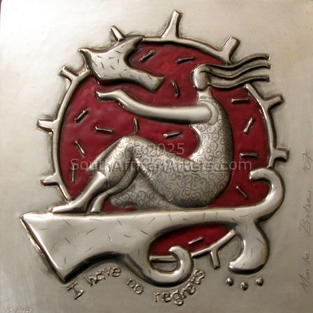 In 2004 Martie discovered pewter as a medium. In working with pewter, she found her love for layering, abstraction and self expression combined. Pewter offers a three dimensional quality to otherwise two dimensional abstractions which leads to multi faceted products, and suites Martie[0x1]s graphic approach. Pewter also offers the artist the ability to age the medium; therefore being able to decide how much [0x1]time[0x1] should be part of the final product.