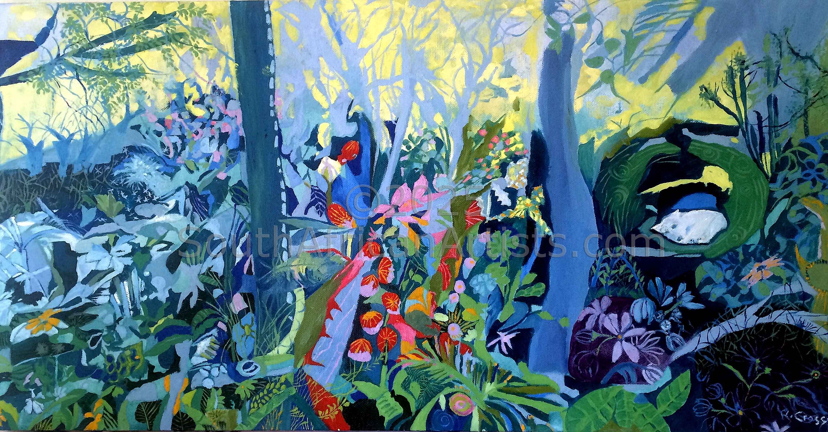 Most of my work is based in the natural world... plants, animals, trees, etc... this is because I have been influenced by my environment which has been predominantly away from the city.. in the bush. I am very aware of the seasons and how it effects the flora and fauna, the habits of birds and insects, and how the light looks different at different times of the year, and the day. Colour is very important to me, (especially blue!). Form and line have to be practised, and observed, but not necessarily religiously followed.