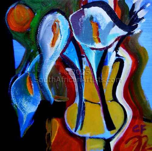 Because I paint fast, acrylic is my preferred medium, I start off a painting with broad painting paintbrushes to allow for a spontaneous background and effect to occur, the painting is then pulled together with a finer brush. When I use oils I do not use brushes but paint with my fingers only. The smaller paintings I do, help me with problem solving in my larger works. Price Range US$ 56-832 Exhibitions Flying Pig Gallery - Hermanus People who chose Celeste's work also chose work by: Find other: