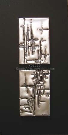Her love for Navajo Indian jewellery, antique silver jewellery & also sculpture led her into experimenting with metals on a larger scale. Rheta now creates HAND BEATEN Wall Sculptures in 0.6mm ALUMINIUM FLASHING, a unique technique that she has been perfecting over many years. It is important to note that this technique is entirely different to pewter work & far harder. Rheta 'draws' on metal, using an adapted screwdriver, hammer, engraver and other adapted tools. These produce a striking effect of light & shadow, which she loves.