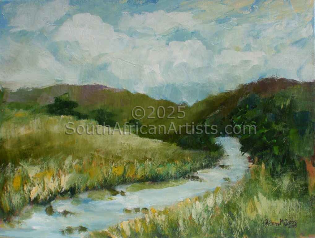 I live on the Bluff in Durban and due to the Bluff's elevation, it has the most spectacular sea views and this is the inspiration for all my seascapes. Durban is sub-tropical and has a lucious growth of beautiful flowering shrubs and trees. One does not have to go far, to be inspired to paint. I enjoy design, colour and texture to create an effect. Sometimes I paint the same flower in three different sizes, to be exhibited together. Ultimately I am a "design" artist, if that makes any sense.