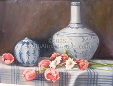 "Delft Vases and Pink Tulips"