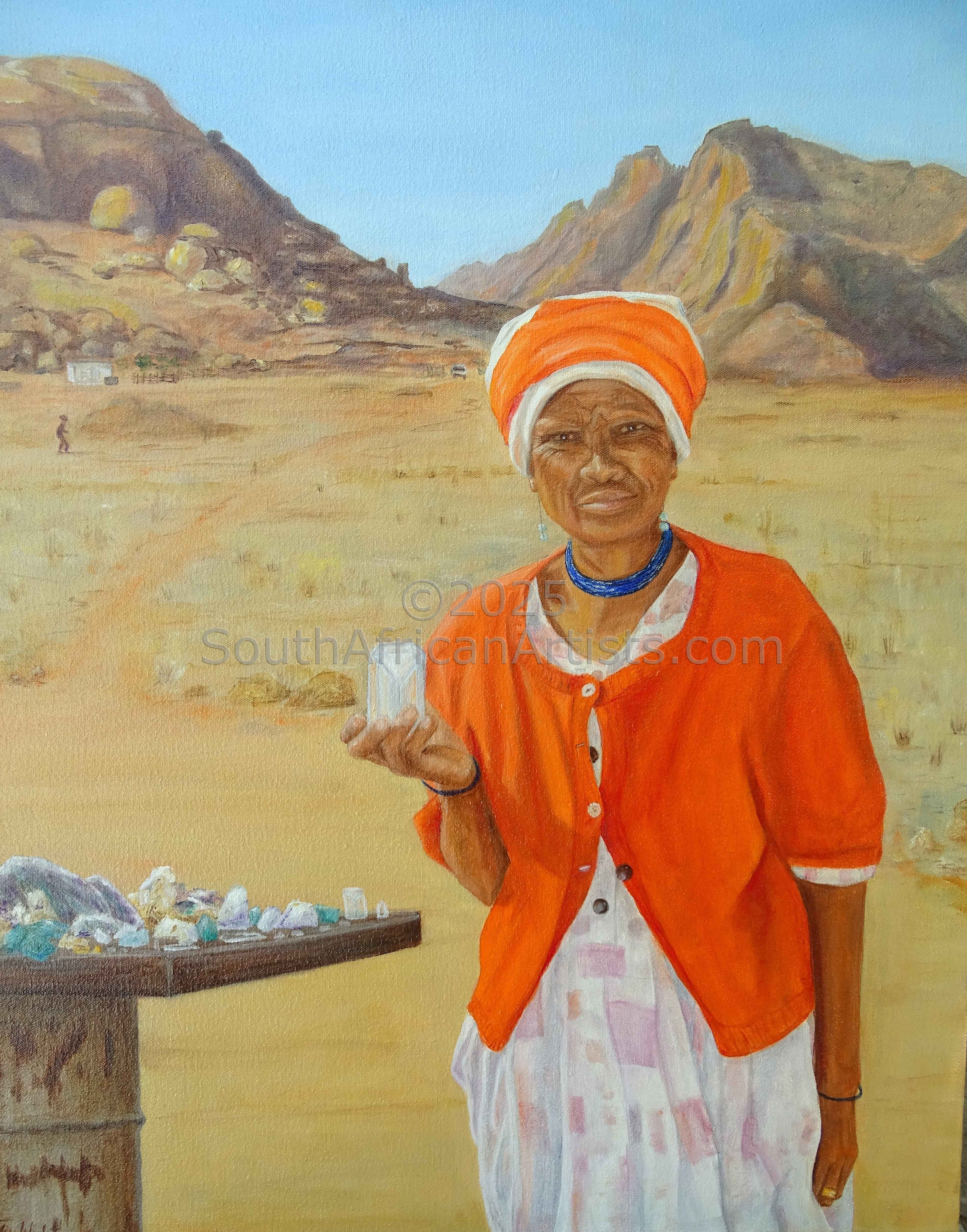 I started my career in art as a woodcarver of decoy ducks and other birds. A man I met at that time had a wonderful set of carving chisels, so I married him. From then on, bringing up an energetic family took precedence over carving, but the hobby took off again as the children grew older, hitting the peak of the decoy-duck-on-the-coffee-table and chintzy cottage-look decor era. As decorating fashions changed and the demand for birds waned, I was invited to join a small art group and then took classes in oils with Andrea Desmond Smith. Simultaneously, I found a gem and mineral club which lead us to wonderful out of the way places, visiting abandoned mines or hunting for crystals. The old mines, old rocks, and old tumbled down ruins had an impact me as they held a hauntingly surreal atmosphere of peoples past, but the contrast of local animals, reptiles and birds added life to the barren areas. Locating colourful mineral specimens among the rocks added to my wonder of Nature's creativity. I brought home large and small stones and learnt how to work them, progressing from green serpentine to blue lace agate, and even carving quartz crystals themselves. It followed on naturally to incorporate in my painting these experiences of unspoiled and remote destinations, be they in the Western or Northern Cape, Namibia, or occasionally further abroad in Australia or Morocco. My painting is eclectic and very realistic, but often has an underlying touch of surrealism to make the viewer pause and consider the unusual. Price Range US$ 120-528 Exhibitions - Education Educated in England People who chose Jo's work also chose work by: Find other: