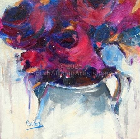 Ballito based artist, Sharleen Boaden (signed BOADEN) has been painting since 2008. Her romantic, whimsical style is instantly recognisable in her favourite subjects including roses, proteas, birds and paper dolls. Sharleen loves working with oils, acrylics and charcoal and pushing the boundaries in application of these mediums. Recently, she has found great enjoyment working on paper, particularly her hummingbird series of charcoal drawings. Sharleen's sensitive nature and love of all things pure and innocent is poetically expressed in her creations. She also writes poetry, some of which have been published in poetry compilations and on Instagram. Sharleen has been the co-owner of two art galleries and continues to be represented by selected art galleries and exhibitions.