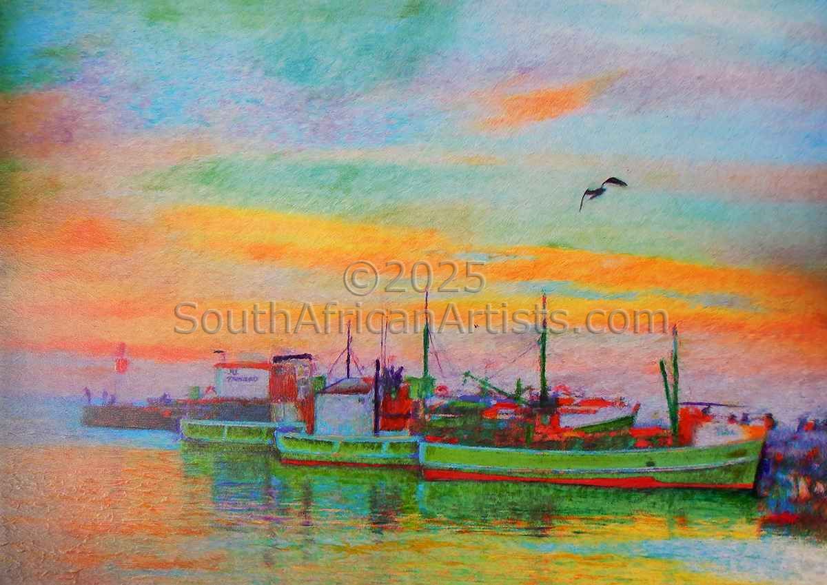 This beautiful painting is of a scene of Hout Bay, near Cape Town. The light of the sunset is reflected in the water and brings out the brilliance of the green fishing boats. It is a magical moment captured in linear time.