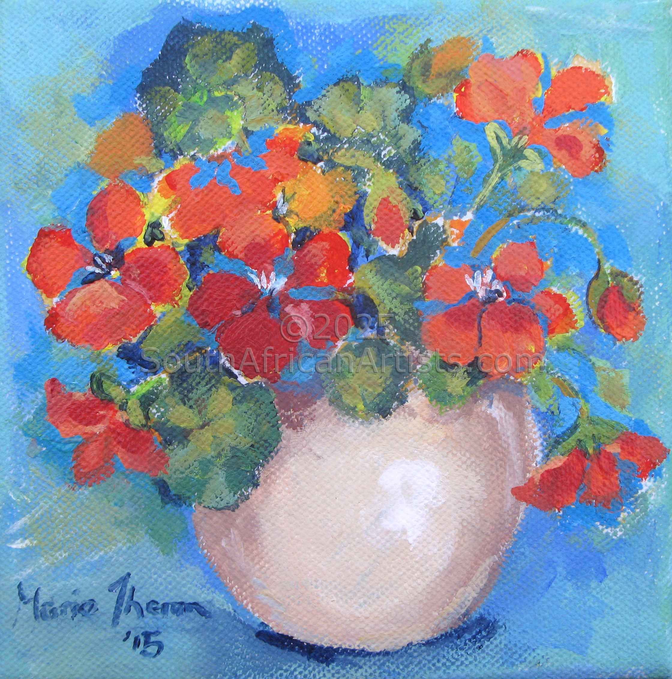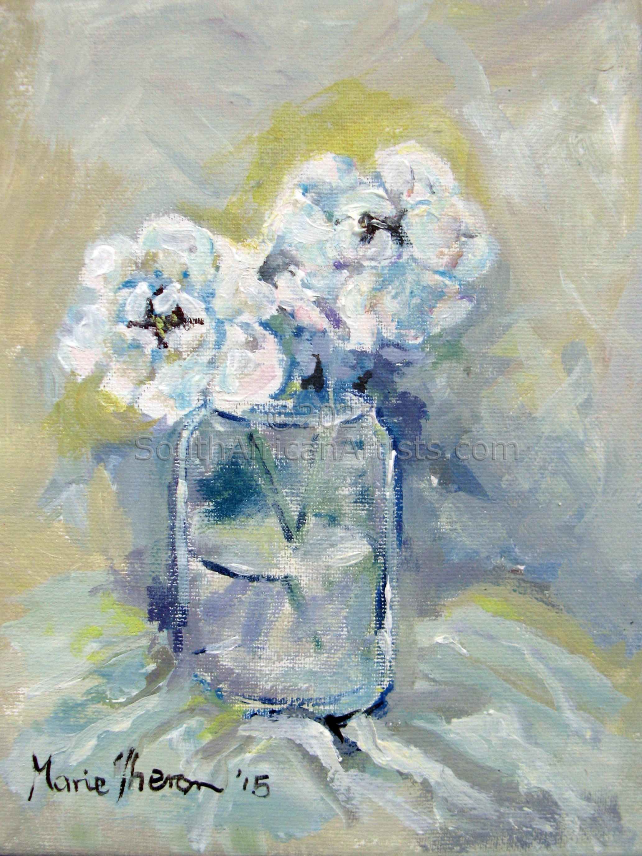 South African Marie Theron (b. 1944) was trained as an Art Teacher. She has held solo exhibitions both locally and overseas and has participated in exclusive group exhibitions. Investors in her oil and acrylic works range from foreign embassies, corporate offices, guesthouses, libraries, hospitals and international private collectors. Her work has sold in Australia, Britain, Canada, Croatia, Ireland, Hungary, the Netherlands, Germany, Austria and the USA (more than 30 paintings in America) She was commissioned by the Ass of Arts Pretoria, the Croatian Embassy and Academia Cravatica in Zagreb to submit a painting "Sister Power" for "The Challenge of the Tie", a world-touring permanent exhibition which toured Pretoria, Johannesburg, Brussels, Prague and Brazilia in 2005 and further around the globe in 2006.