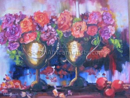Studied HED Domestic Science at Potchefstroom University during which time she was introduced to the arts. Started painting in 1995 took art lessons over a period of 4 years from various artists in Mpumalanga namely : Melite Grobler, Belinda Wessels, Carel Maree and Boe v Zyl. Prefers working in oil as a medium.Views work as realistic, romantic and at times impressionistic and has a passion for romantic scenes with figures, flowers and fruit
