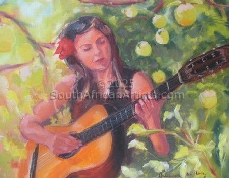 Studied HED Domestic Science at Potchefstroom University during which time she was introduced to the arts. Started painting in 1995 took art lessons over a period of 4 years from various artists in Mpumalanga namely : Melite Grobler, Belinda Wessels, Carel Maree and Boe v Zyl. Prefers working in oil as a medium.Views work as realistic, romantic and at times impressionistic and has a passion for romantic scenes with figures, flowers and fruit