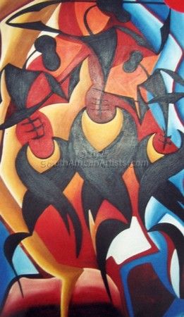 During her training as a clothing designer she ecquired knowledge of figure drawing, colour and textures. This ability proved to be of great ddvantage when she became aware of the intriguing expressions f the 'Xam people' (Bushman) in their Rock Art, while visiting sites known for this art form. Spiritual symbols in geometric forms which they used to communicate through in trance dancing, fascinated her and inspired her to use these symbols to create paintings with a strong modern feel but with a very ancient spiritual connotation. Her love for nature, people and experiences made her very creative and original.