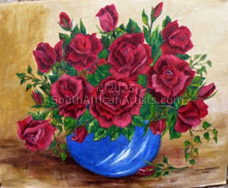 As a child I always loved drawing, sketching etc. Worked many years as a bookkeeper with the thought in mind that I oneday would like to paint. At that stage I never had the time to do so. After retiring I was bored with nothing of value to do so had many hobbies ie needlepoint, knitting, sewing, decopage, beadwork, crochet, reading, fabric painting etc. My husband and I have lived on our Dairy Farm in Macleantown for the past 45 years. We have one son who with his wife and our two grandsons live on the farm. Eleven years ago I was inspired by my younger sister Valerie Weber to start painting. Her paintings were magnificent. After taking some basic lessons I developed my own style of painting using oils on canvas. I simply enjoy painting whatever the subject may be. My favourite, being animals and flowers. I have exhibited and sold mostly in South Africa. Exhibitions at Queenstown, King Williams Town, Stutterheim and East London. I also sold a painting to someone in New Zealand. God willing I will continue painting for many more years. Price Range US$ 65-125 Exhibitions Exhibited at art shows in Queenstown, Stutterheim, East London and King Williams Town. Education Self Taught People who chose Sylvia's work also chose work by: Find other: