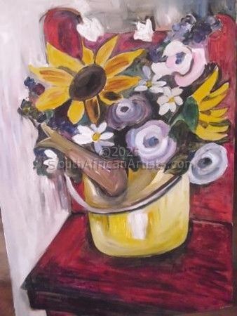Born and bred in Potgietersrus (Mokopane) 1964. Always wanted to paint everything my eyes saw, the dry grass, the grey rocks. Never had money to study art so the safest way was to become a teacher. After my first husband died and I got remarried I started to paint. My first art teacher was Kathryn van Schalkwyk a well known watercolour artist. From there the Holy Spirit taught me while reading my bible, therefore I think my work are more spiritual...every colour symbolizes something according to Gods word, the "lilies" symbolises..not to worry. My work are all original pictures that flow out of a full heart. I live in Great-Brakriver and am involved at Ons Shoppe at the Oude Pastorie. Price Range US$ 70-910 Exhibitions Strydoms yearly South-Cape exhibition Education teacher qualification at N.K.P. People who chose Anna-Mart's work also chose work by: Find other: