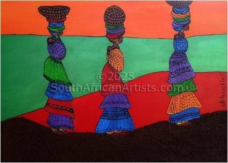 The African woman inspires me. I love to paint them, with pots on their heads and multi coloured, layered clothing. Florals are also up there with my favourites. Poppies, tulips and calla lillies are amongst my favourite. Roses also crop up from time to time.